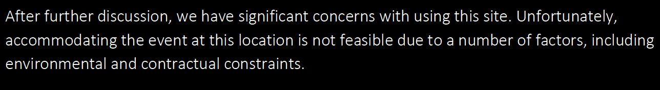 “After further discussion, we have significant concerns with using this site,” Krueger wrote. “Unfortunately, accommodating the event at this location is not feasible due to a number of factors, including environmental and contractual constraints.”