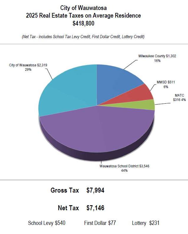 The average Wauwatosa home is now valued at $418,800, according to the city. The owner of a house with that value will now owe $7,146, with 29%, or $2,319, supporting the City of Wauwatosa tax levy. The Wauwatosa School District's portion of that same average tax bill is $3,546, or 44%. The third largest taxing authority is Milwaukee County with a 16% share, or $1,302 on an average home.