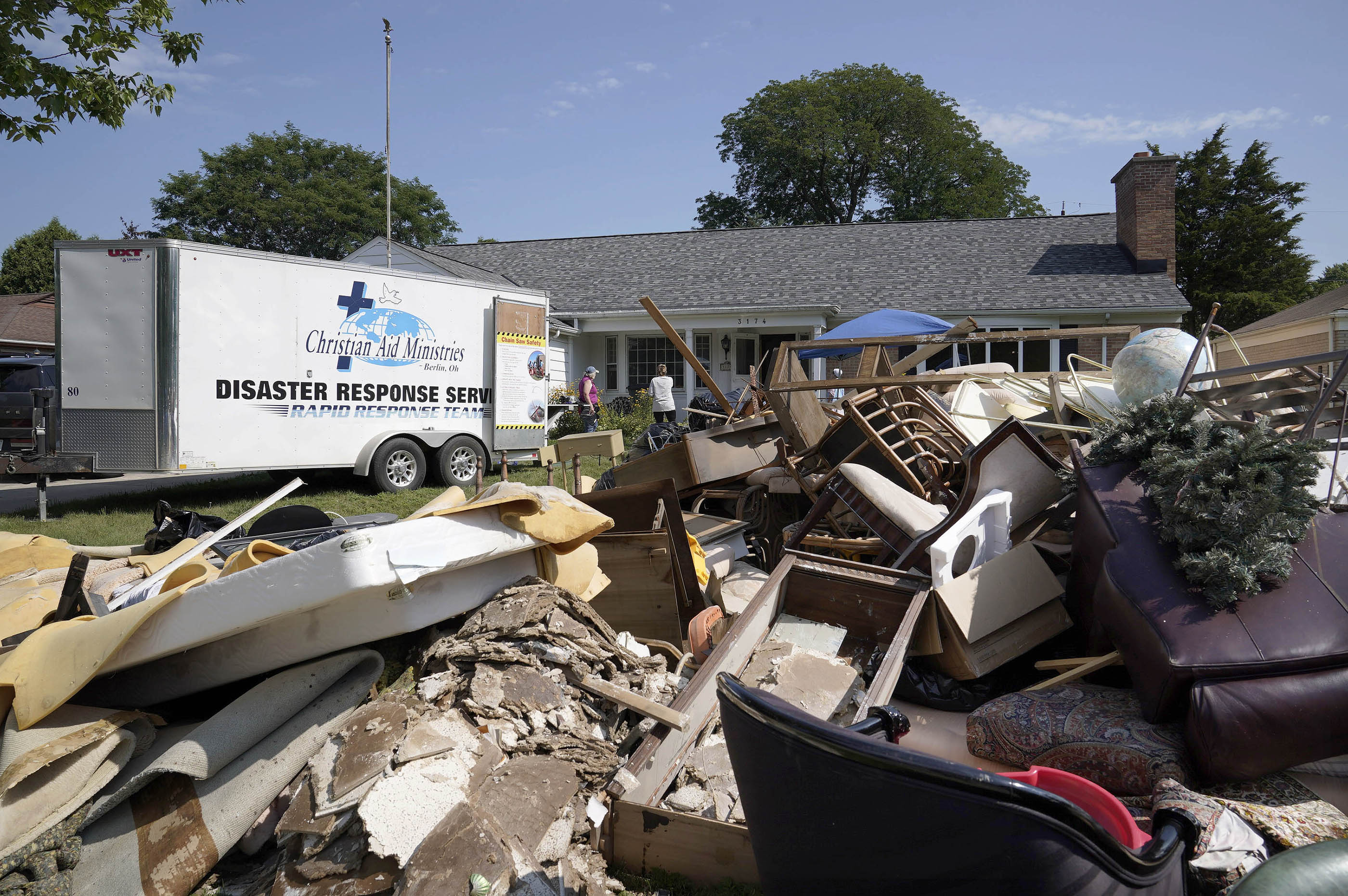 Next door to the Baxters, Allison Bednarski and her husband, Matt, sat in lawn chairs with two friends taking a break from the stress of moving their soggy possessions to the curb and assessing the damage. Like the Baxters, the floodwaters rose several feet in their basement while thankfully not reaching as high as their main living space.