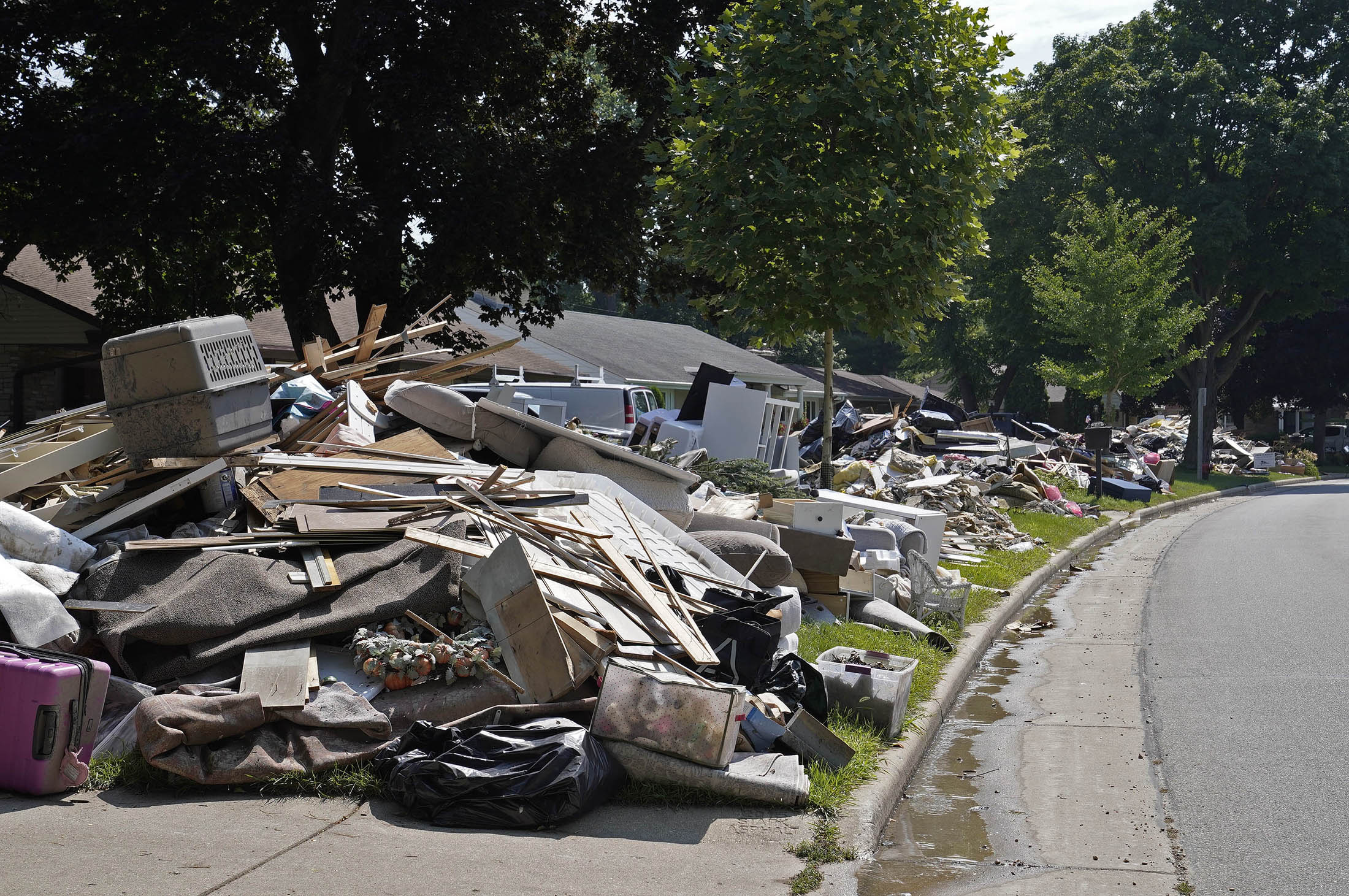 The City of Wauwatosa said Aug. 15 that its Department of Public Works had already collected about 250 tons of residential flood debris. Residents with flood damaged items anywhere in the city have been encouraged to place them on the curb for pickup, a process that for now will take the place of the city's yard waste pickup. The city expects the total tonnage to continue rise with as more residents clean out and crews pick up.