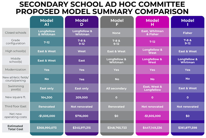 The school district initially presented the committee with seven possible options, each with cost estimates attached. Committee members later proposed three additional models. Those 10 were narrowed down to the remaining five at meetings in late September and early October.