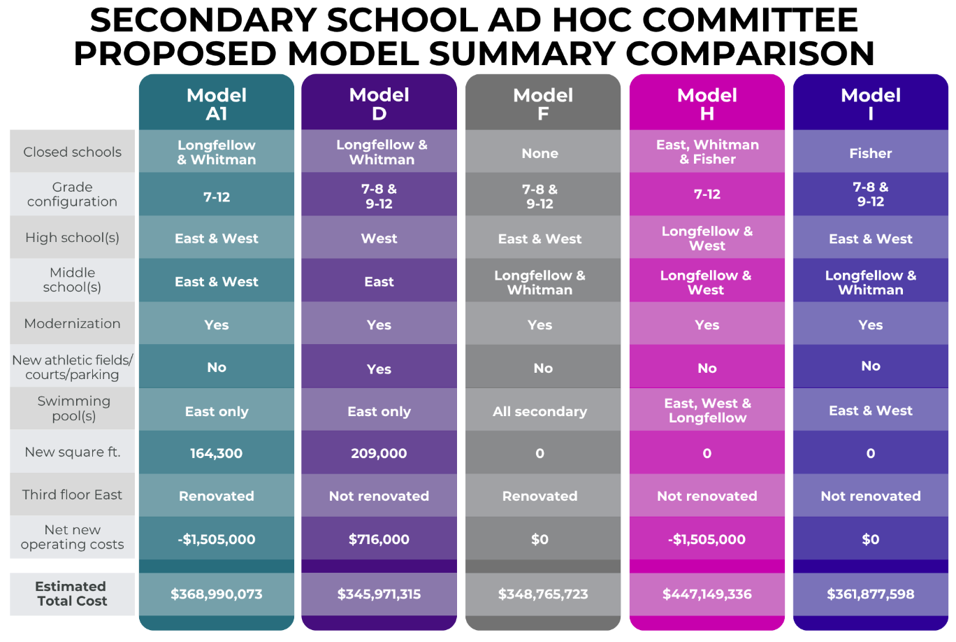 The Wauwatosa School District released updated cost estimates for the five options currently being discussed by the Secondary Schools Ad Hoc Committee for reconfiguring and renovating the city's four high school and middle school buildings.