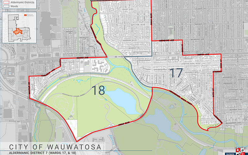 District 7 — Several neighborhoods along the Menomonee River and Underwood Creek just northwest of Tosa Village are part of this district, including all of Swan Park and Parkway Estates. It also straddles the segment of North Avenue that includes the business district known as Midtown.