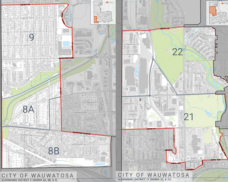 District 9 — Wauwatosa’s southwest corner, this district includes parts of the Fisher Woods and Underwood Parkway neighborhoods. It is bisected by the parkway and Underwood Creek, with greater density and more compact lots on the far south side, south of Bluemound Road.